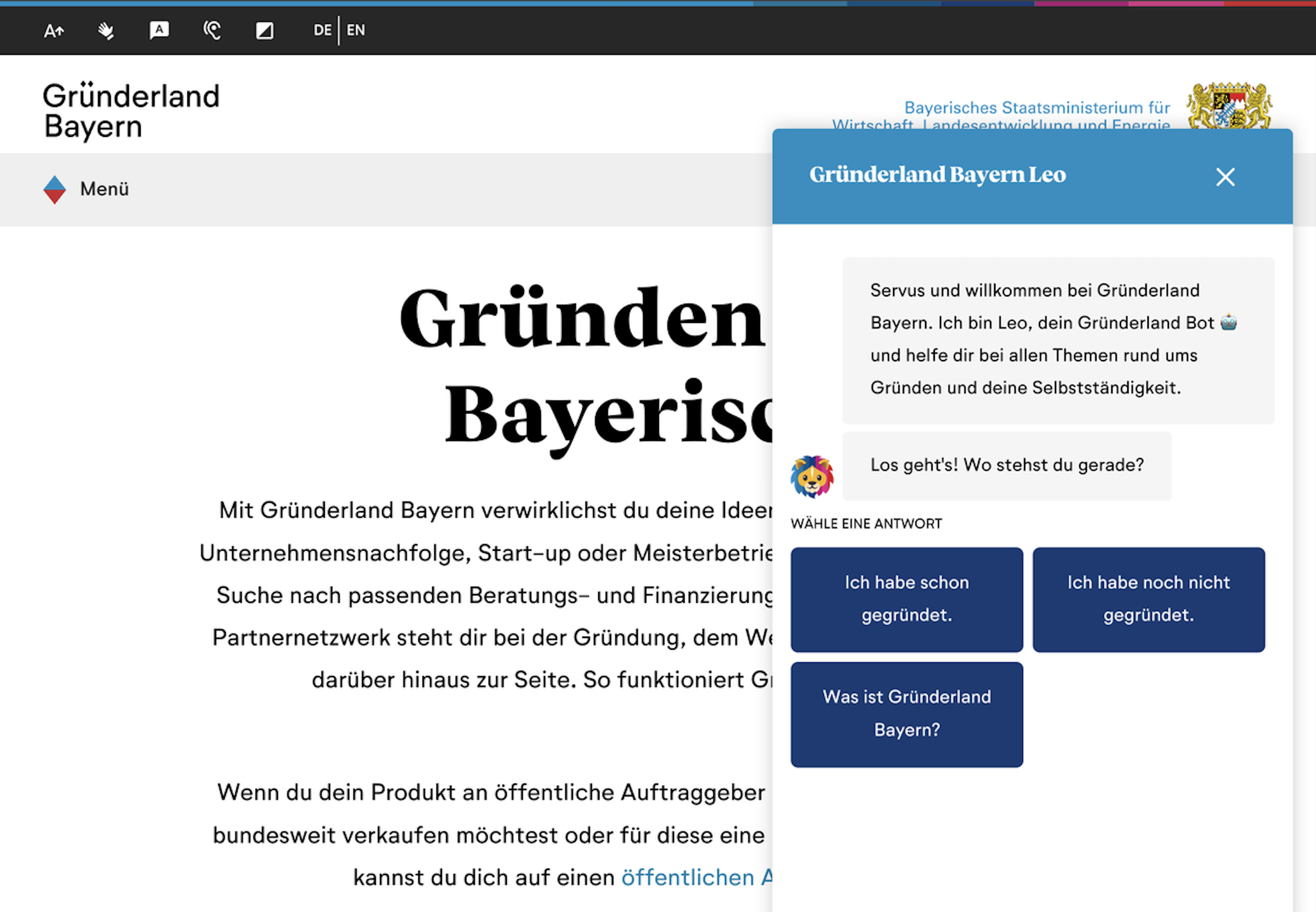 The project resulted in a clear set of evidence-based recommendations for improving the chatbot’s usability, relevance, and overall perception. Through a heuristic UX audit, analysis of usage data, and moderated user interviews, we identified key friction points — including unclear entry points, insufficient communication of the chatbot’s purpose, and a lack of contextual triggers guiding users toward Leo at the right moments. These insights were translated into actionable improvements: refined conversational framing, a more prominent and strategically placed access point, better expectation-setting, and the integration of contextual relevance cues rather than passive availability. The outcome is a roadmap that enables Gründerland Bayern to reposition Leo as a meaningful, supportive touchpoint in the founder journey, rather than a peripheral feature.