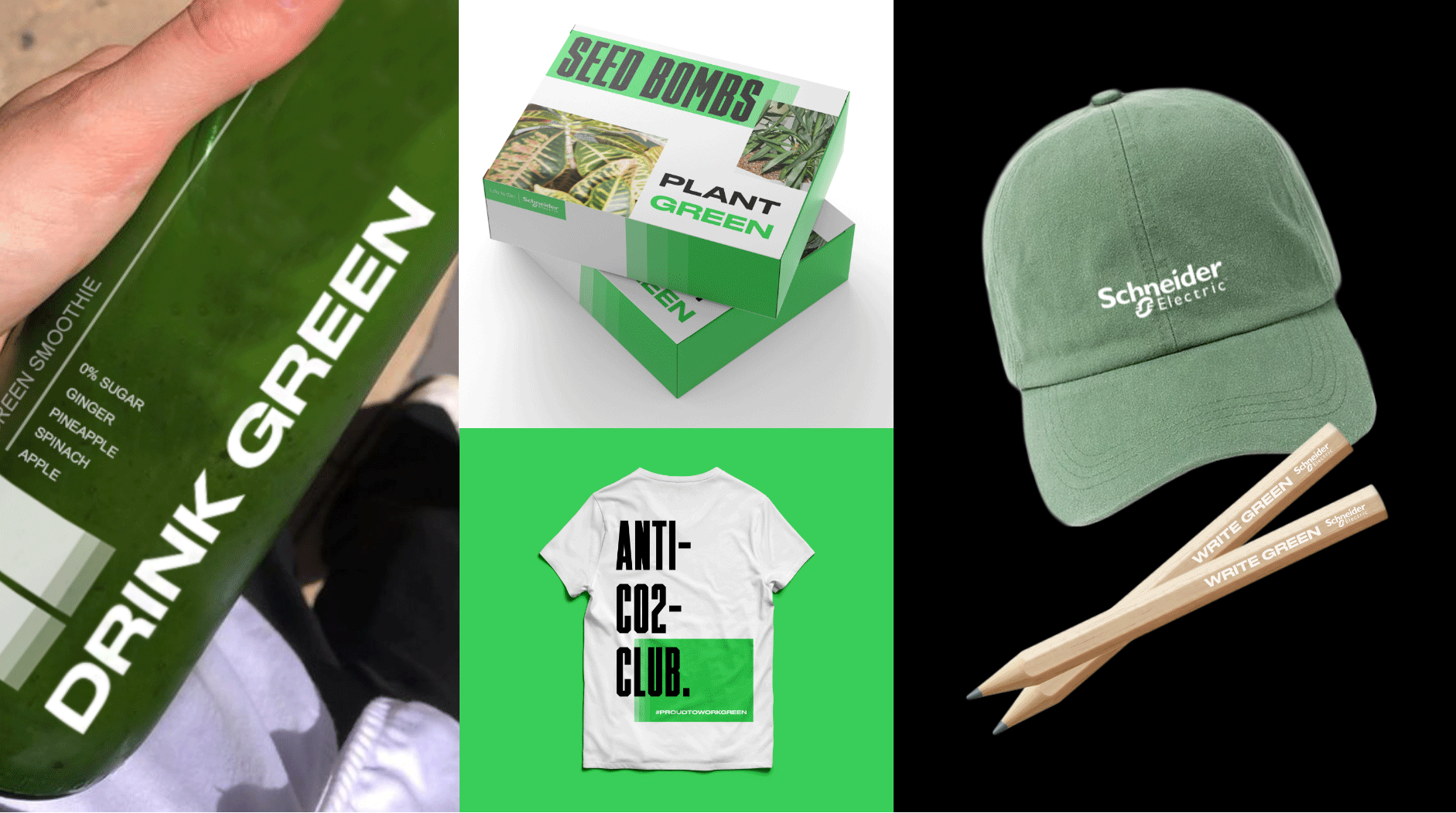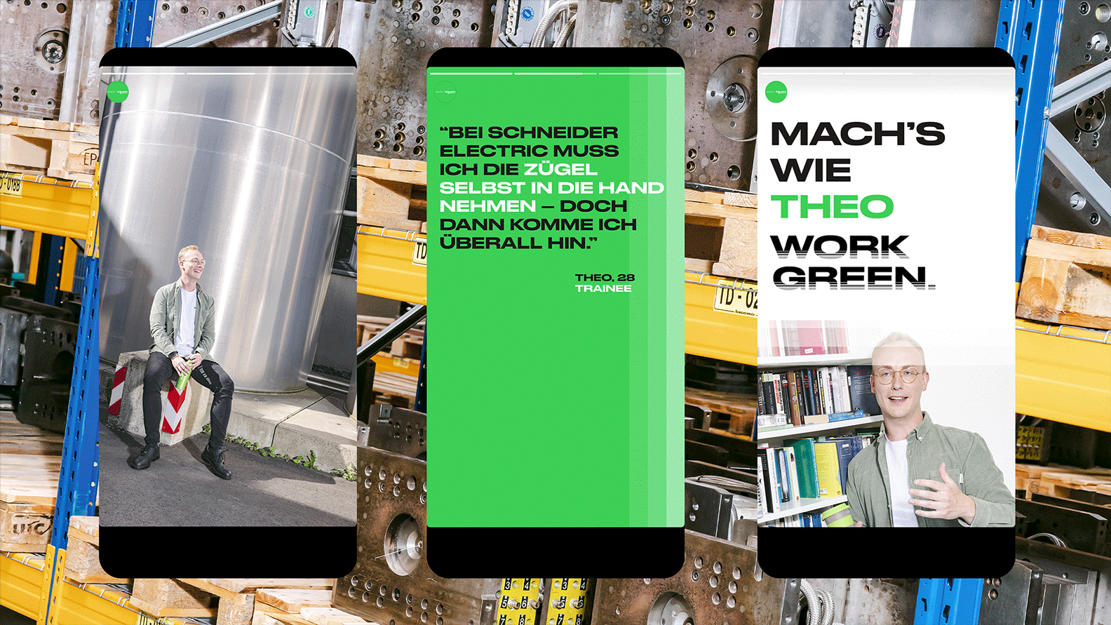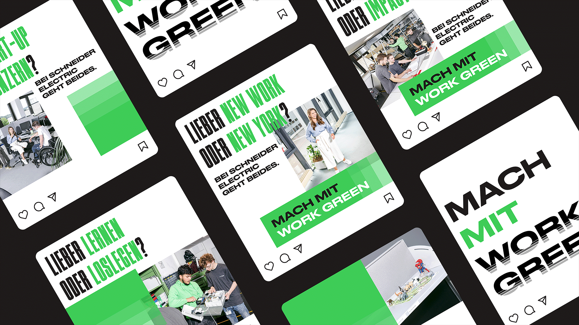 This Employer Branding Campaign for Schneider Electric was set in the DACH region with the claim “Work Green” — focusing not only on the benefits of the job, but also on the environmental impact. A whole Design System was projected to unify all formats and expand the production of the headline in different applications – static and animated Social Media formats, Merchandising and Fair Booths. We also created an animation style to fit the campaign identity which was applied to Instagram story Ads, supporting the holistic approach of symbiosis between layout, graphic identity, motion and imagery.